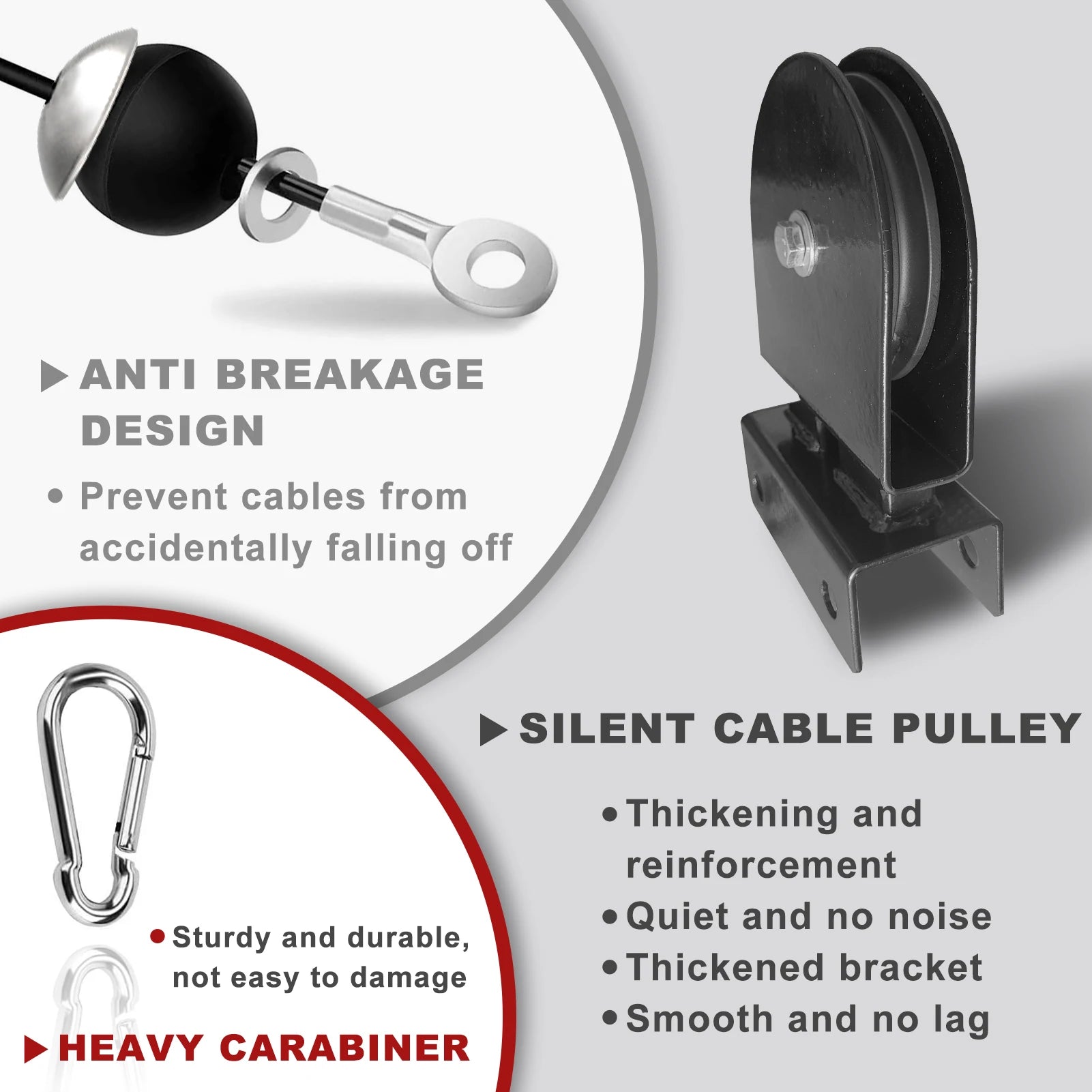 - Adjustable front pulley that swings left and right; when you install two sets side-by-side, you gain a wide, fluid range of motion for your compound lifts.